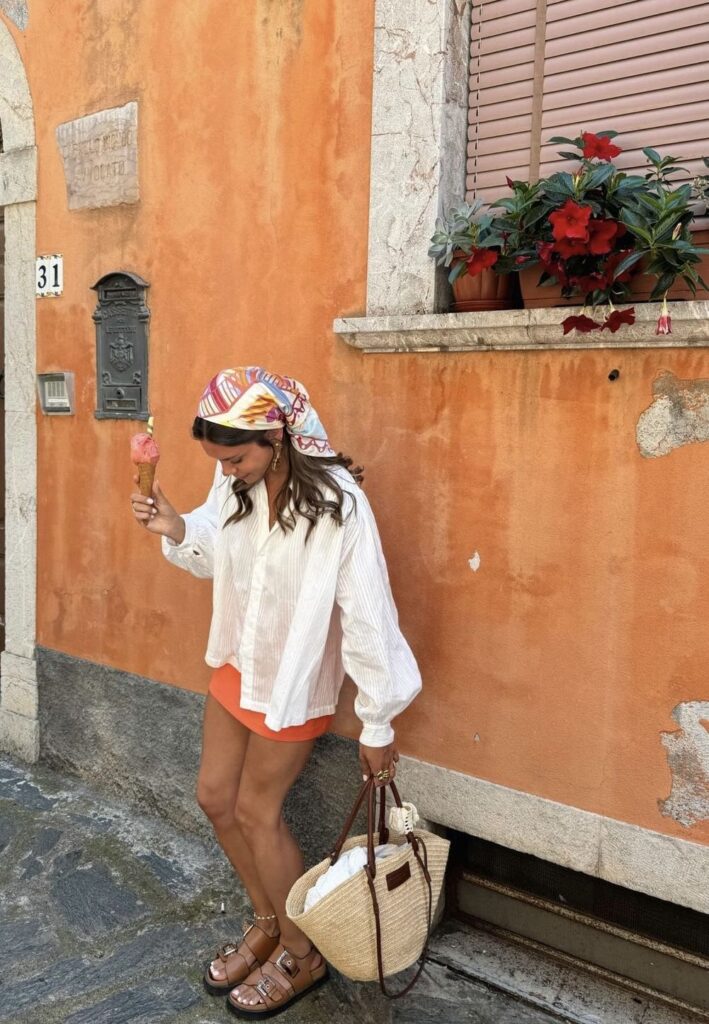 The silk scarf tied around the hair adds a touch of Italian Riviera charm, especially when paired with gold hoop earrings and chunky leather sandals. A roomy straw tote brings in vacation practicality while enhancing the relaxed vibe. It’s the kind of effortlessly chic outfit that looks just as perfect in a cobblestoned piazza as it does in your next travel album.