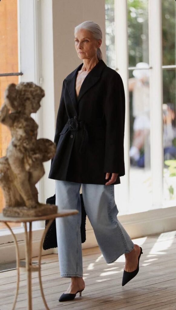 Nothing says refined ease like a pointed black kitten heel mule—and this look builds everything around that quiet power. The cropped light-wash jeans offer a fresh, casual contrast to the sleek structure of the shoes, while the belted black blazer cinches the waist and adds instant sophistication. It’s a perfect blend of sharp tailoring and relaxed denim that feels modern, not fussy.