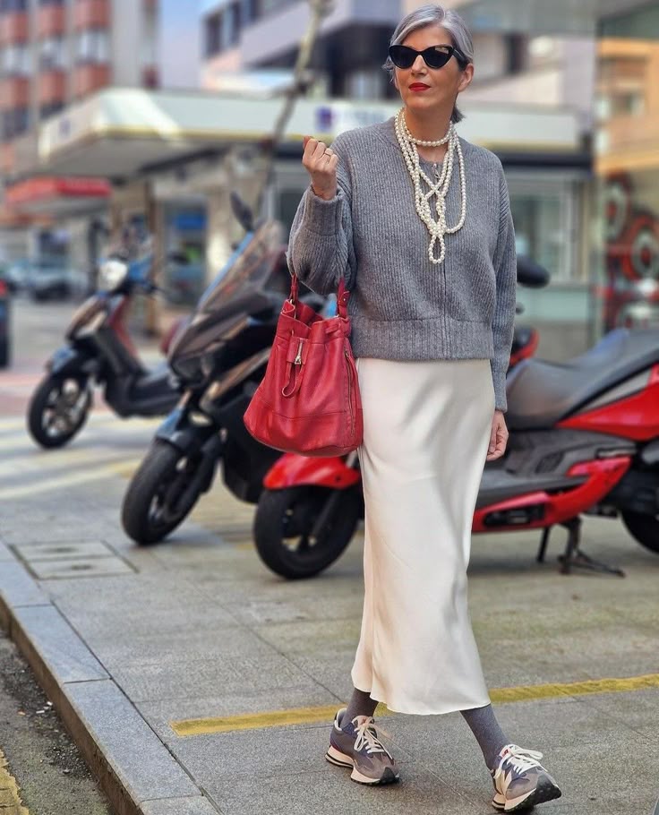 Who says pearls and sneakers don’t mix? This look is proof that contrast is queen in 2025. The chunky retro sneakers bring a sporty twist to the soft, slinky ivory midi skirt, while grey tights keep it weather-appropriate and street-style cool. On top, a cozy grey sweater is layered with multiple strands of pearls—equal parts elegant and unexpected.