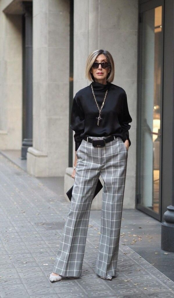 This outfit proves that elegance doesn’t have to try too hard—especially when your shoes are doing the heavy lifting. The pointed-toe flats peeking out from tailored plaid trousers add a polished, feminine edge without sacrificing comfort.