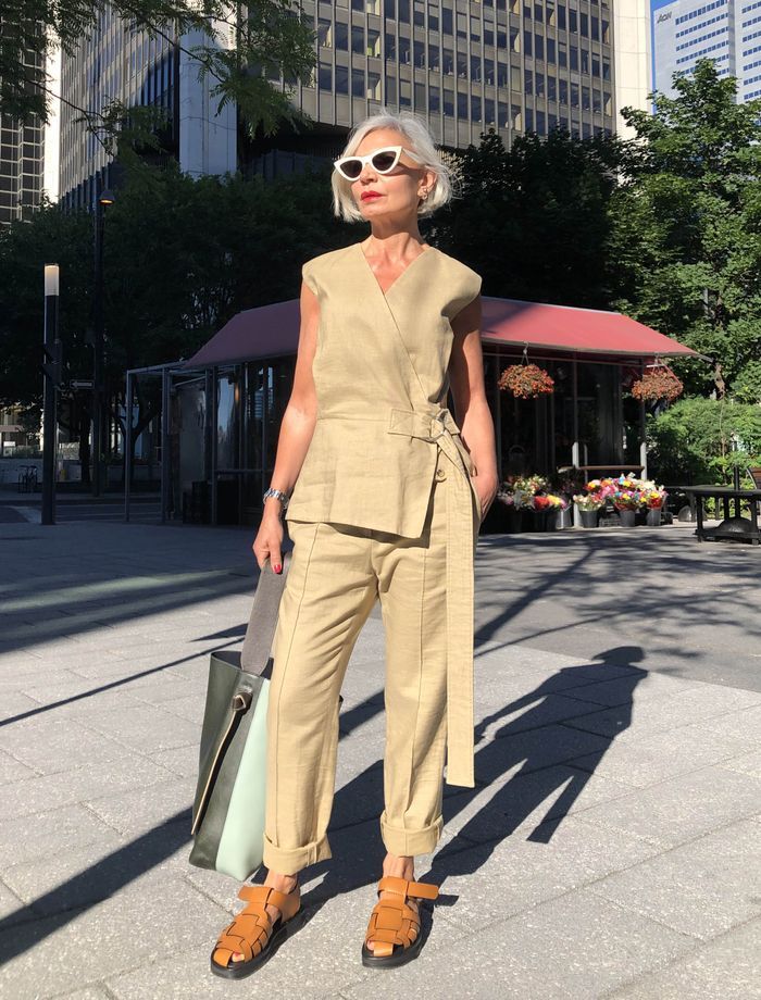 The sleeveless wrap top and cuffed trousers feel fresh and sharp, especially paired with bold white cat-eye sunglasses and a swipe of red lipstick. A roomy two-tone tote finishes things off with a practical punch. These sandals prove that you can be bold, breathable, and fabulous—all without a single heel in sight.