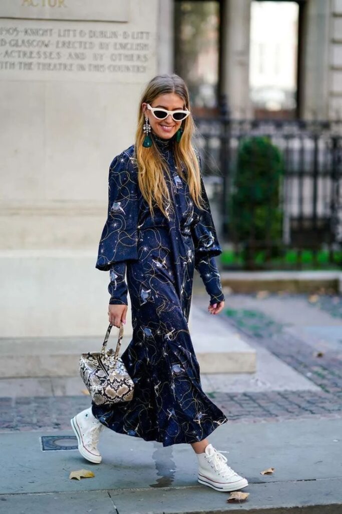 This outfit channels laid-back luxury with a cosmic twist. The navy maxi dress, adorned with gold swirling patterns and subtle celestial motifs, creates a dreamy, almost ethereal vibe, while classic white Converse high-tops keep the look firmly grounded in casual cool.