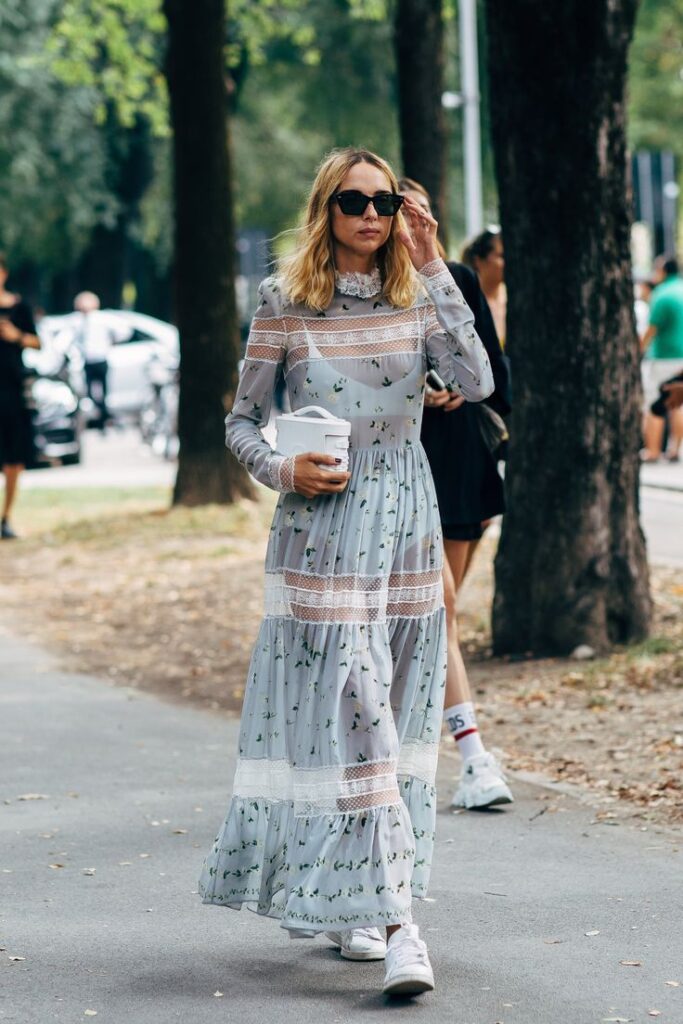 The contrast between the delicate pattern and the heavy-soled trainers feels super fresh for spring/summer 2025. Add in sleek white sunglasses and a cinched belt, and you’ve got a street style–ready outfit that balances polish and playfulness. This combo is proof that a feminine silhouette can totally hold its own alongside oversized, athletic footwear.