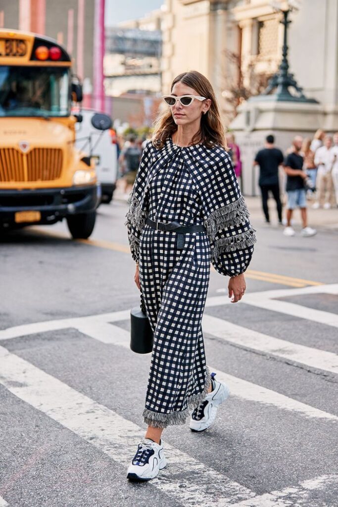 This look is all about blending vintage-inspired charm with sporty edge. The black-and-white gingham midi dress, complete with statement sleeves and fringe details, brings a classic feel that’s instantly elevated by bold, chunky dad sneakers.