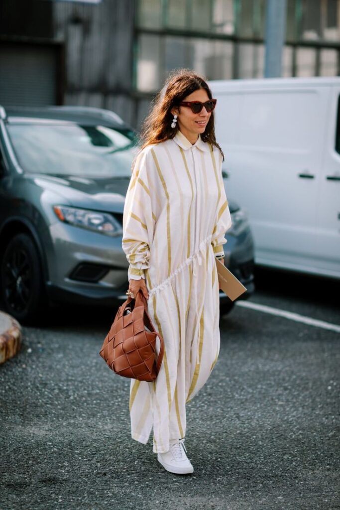 For a look that screams easy elegance, this striped maxi shirt dress styled with crisp white sneakers is a winner. The dress’s oversized fit and subtle yellow stripes give it a breezy, relaxed vibe that’s perfect for hot summer days. Paired with minimalist sneakers, it keeps the whole outfit looking polished yet casual.