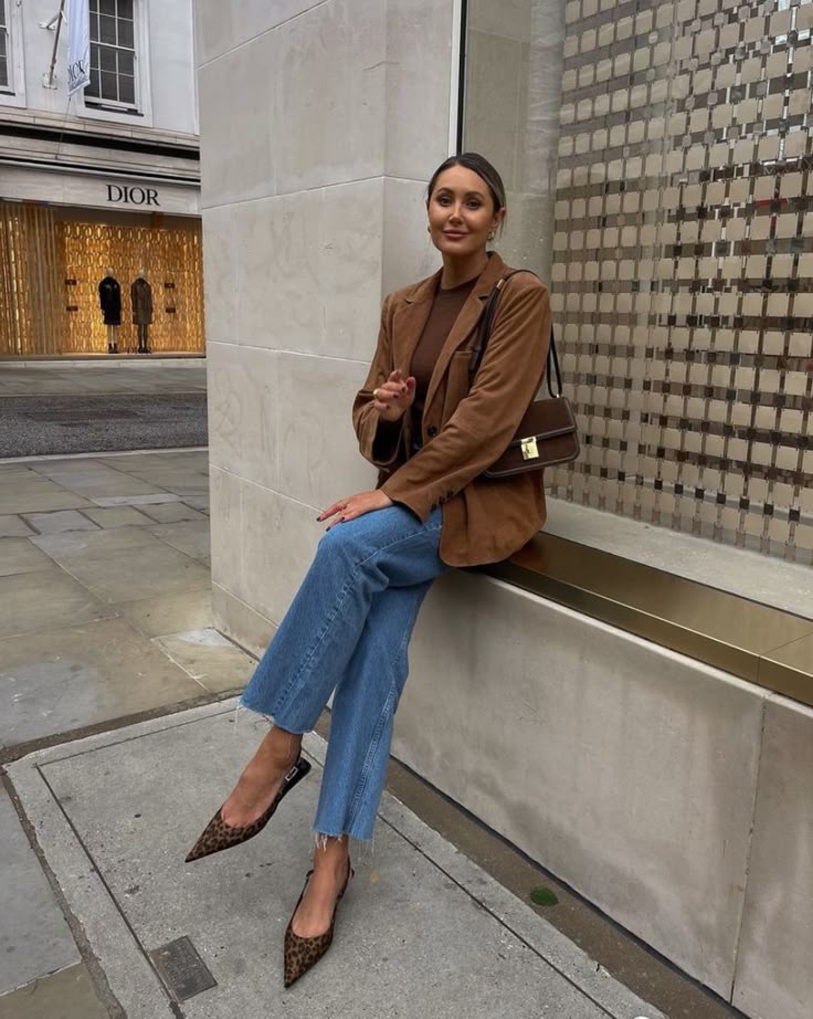 This outfit proves that animal print heels can be just as timeless as a trench coat. The rich brown tones in the blazer and sweater create a refined monochrome moment, while the cropped jeans keep things casual yet polished.
