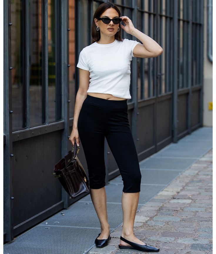 A better option? Swap capris for ankle-grazing trousers, cropped jeans, or linen pants, and pair them with a sleeker shoe like flat leather slides, platform espadrilles, or even a low mule. These changes keep the outfit breezy while preserving a sense of proportion and polish.