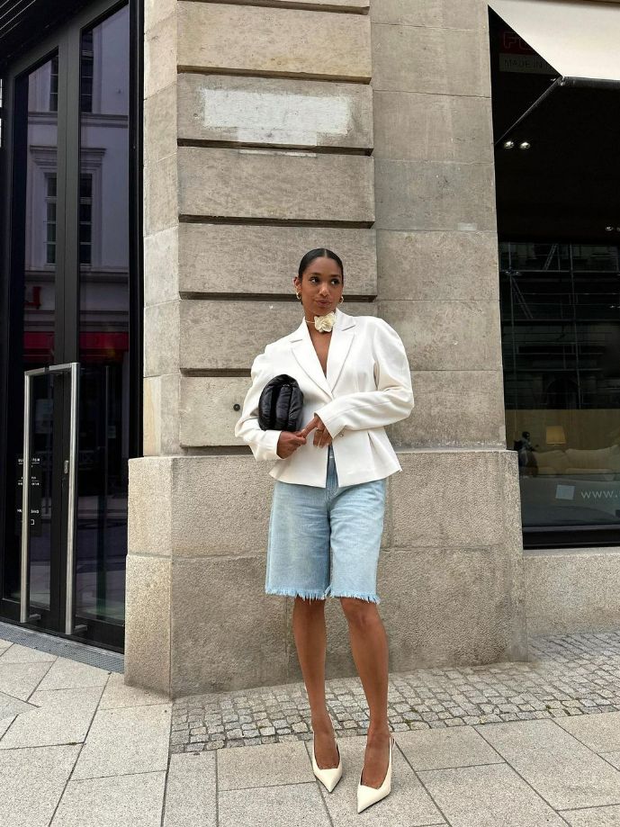 The dramatic, tailored blazer and oversized flower pin push the outfit into fashion-editor territory, but it’s the shoes that seal the deal—elongating the legs and creating a streamlined silhouette. The contrast between sharp heels and laid-back denim gives the outfit just the right dose of tension and cool. If you’re dressing up Bermuda shorts in 2025, pointed-toe pumps are a power move.
