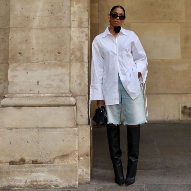 Forget everything you thought you knew about Bermuda shorts—this look flips the script. The faded, frayed denim shorts are intentionally oversized and paired with an equally relaxed white button-down, creating an ultra-casual base. But then come the structured black knee-high boots, and suddenly the whole outfit shifts from basic to editorial.