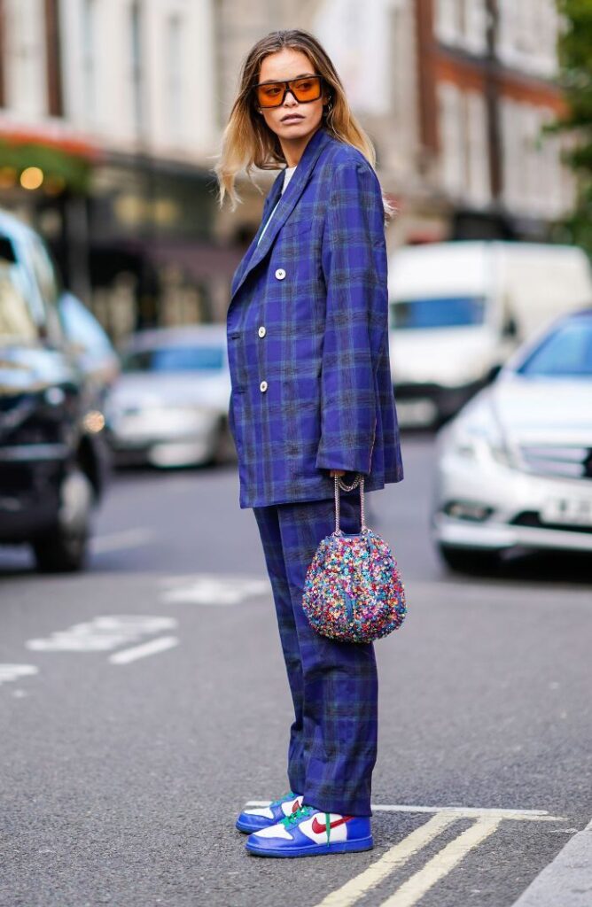 Paired with oversized amber shades and a sequin-covered bag, the mix of textures and tones proves that polished and playful can absolutely coexist. Perfect for anyone ready to redefine suit dressing with an athletic edge.