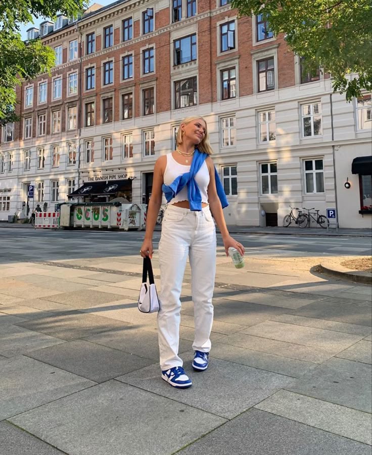 Wide-leg white jeans keep the look fresh and modern, creating a crisp canvas for the bold blue sneakers, which inject a pop of vibrant energy. The denim patchwork bag introduces texture and a hint of vintage charm, making the ensemble even more dynamic. Finished with sleek sunglasses and a polished low bun, this look effortlessly balances comfort and cool, ideal for urban strolls or relaxed weekends.