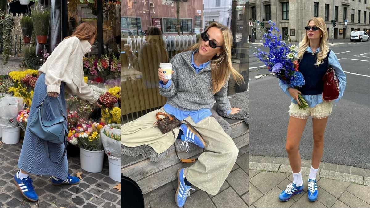 Crew socks add a playful, retro edge, and the black textured shoulder bag pulls the outfit together with an understated cool factor. With the addition of bold sunglasses and tousled blonde waves, it’s a street-style moment that proves blue sneakers can elevate even the most pared-down pieces.