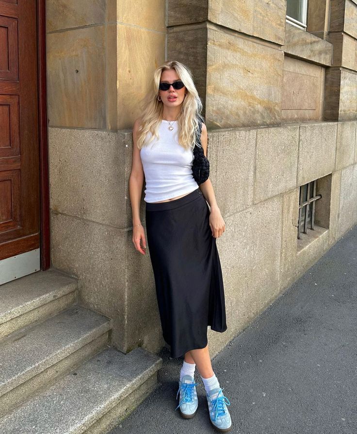 Effortless yet eye-catching, this outfit strikes the perfect balance between sporty comfort and sleek sophistication. The fitted white tank and fluid black midi skirt create a timeless silhouette, while the vibrant blue sneakers introduce an unexpected pop of color that keeps the look fresh and modern.