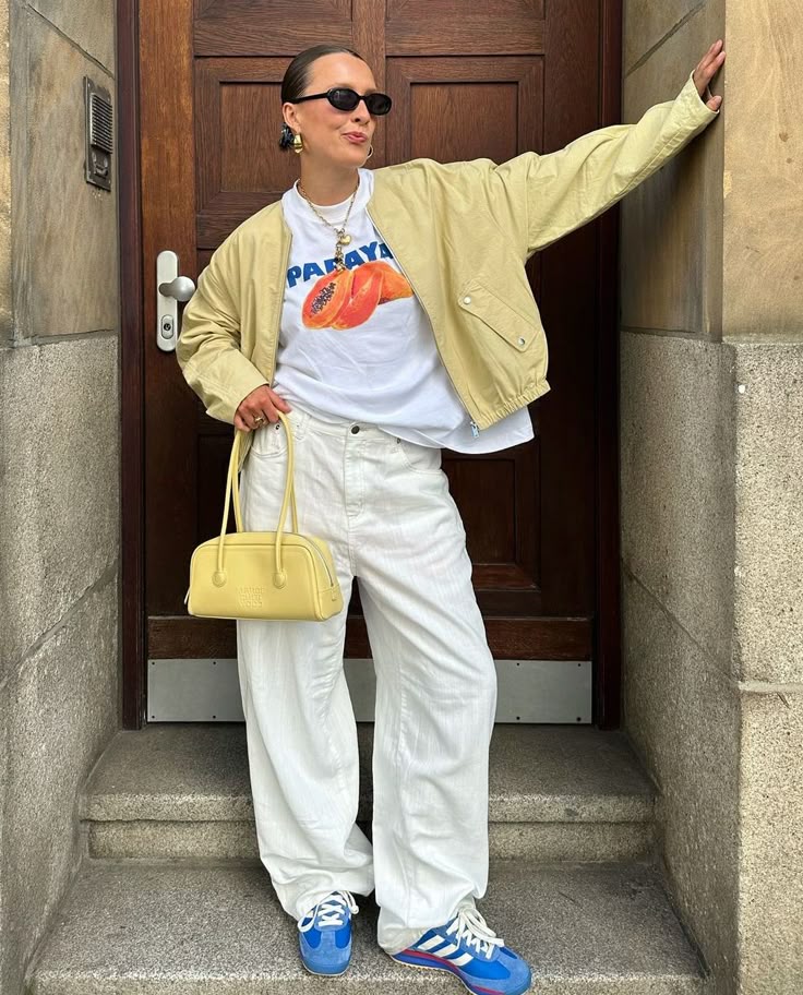 A fresh burst of casual confidence, this look proves that playful colors and relaxed silhouettes can be incredibly chic. The vintage-inspired papaya tee adds a whimsical pop beneath a light yellow bomber jacket, while wide-leg white trousers keep the outfit crisp and laid-back.