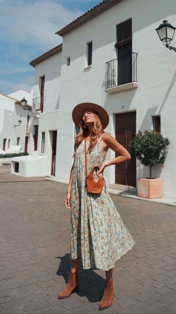 With a graceful swing and earthy tone, this pairing brings a refined edge to the boho aesthetic. The soft floral midi dress feels breezy and romantic, while the addition of suede ankle boots anchors the look with rich texture and structure.