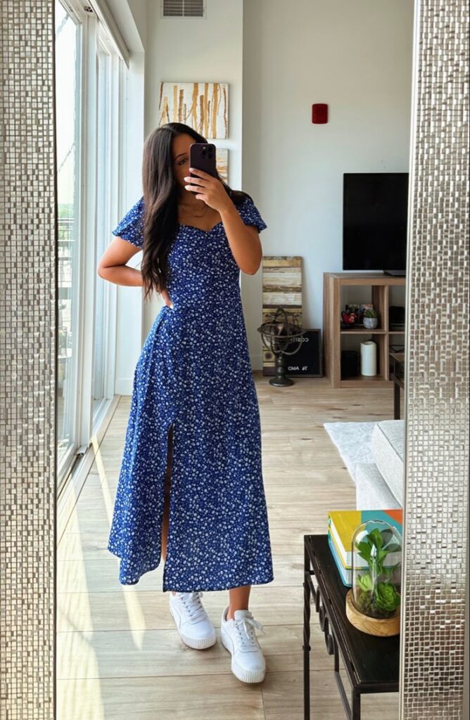 A casual punch meets romantic whimsy in this refreshing take on boho dressing. The dainty floral print and flirty slit of the dress bring effortless femininity, while the chunky white sneakers add a youthful, grounded contrast that feels distinctly modern.