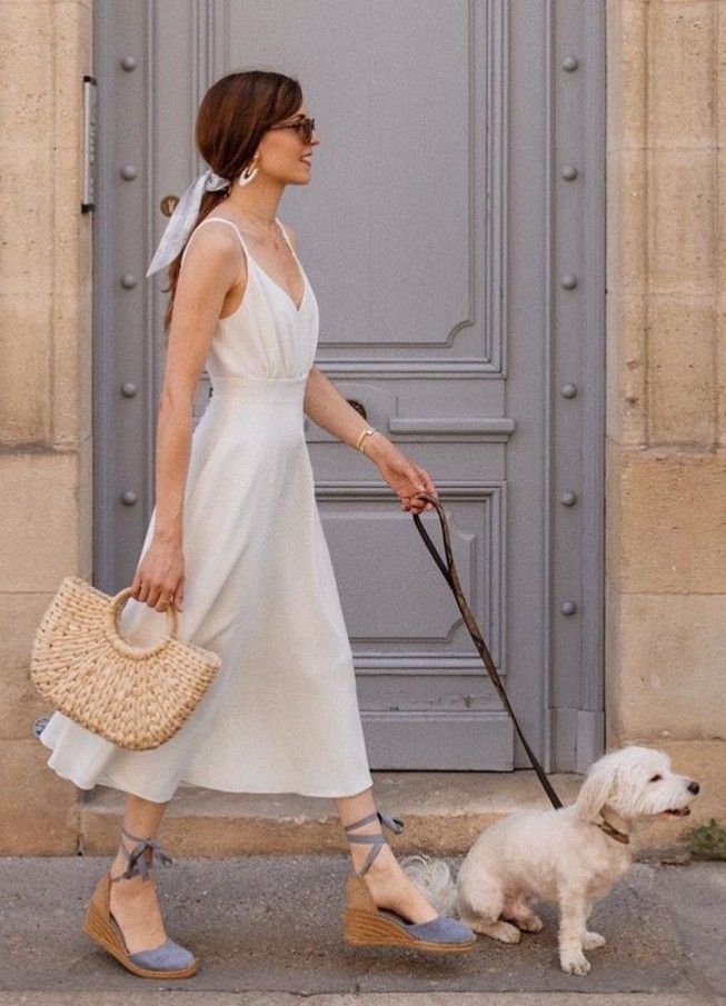 Her natural straw bag and airy white dress complete the look with a breezy, romantic feel, perfect for walking your pup through sunlit streets. The headscarf and oversized earrings add a subtle retro twist, proving that relaxed can still be incredibly refined.