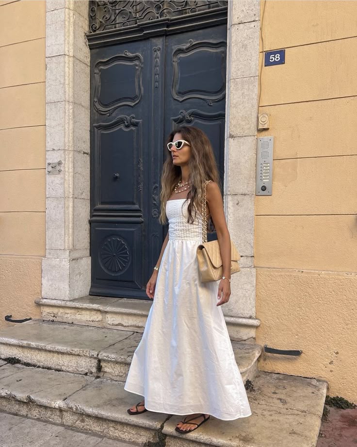 Channeling effortless summer elegance, this pairing of a white smocked boho dress with thin strappy black sandals feels like a breezy stroll through a sun-drenched village. These minimalist sandals strike a perfect balance between relaxed and chic, letting the billowing lines of the dress do the talking while anchoring the look with understated finesse.