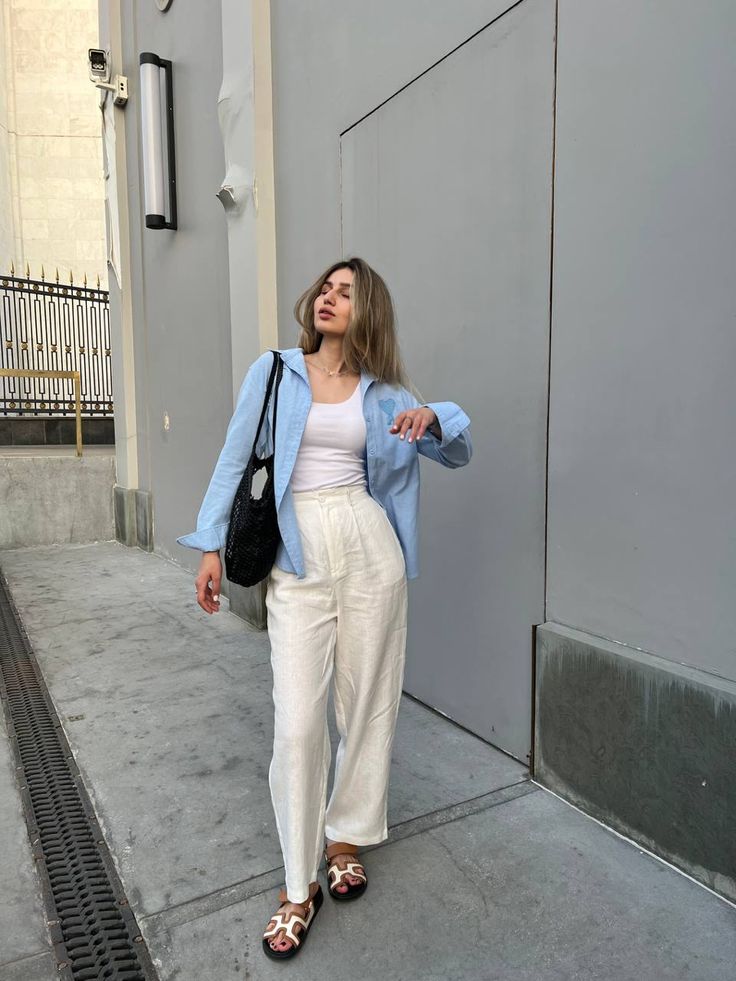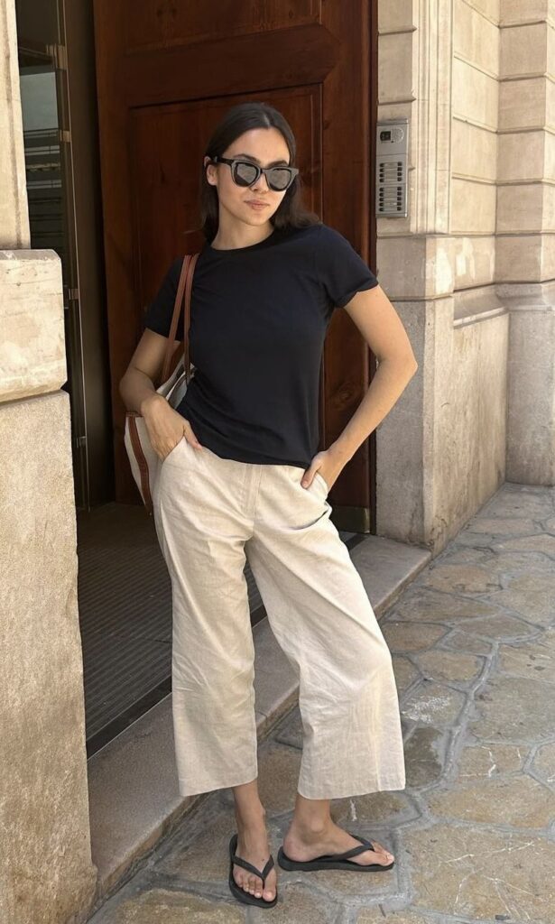 Perfect for city strolls or leisurely brunches, this combination proves that swapping denim for lightweight linens—and pairing them with sculptural sandals—creates the ultimate summer “anti-jeans” uniform.