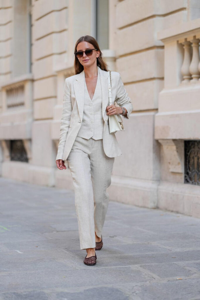 It’s proof that a crisp linen three-piece needn’t be reserved for formal settings: pair it with flats for the ultimate chic, anti-jeans statement.