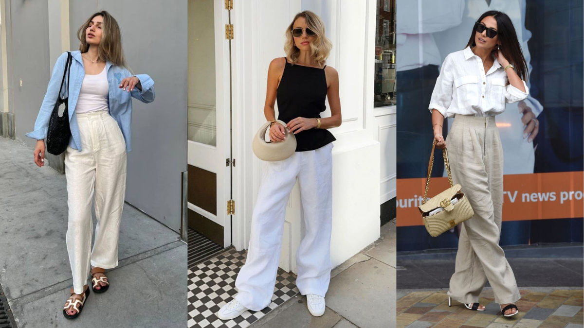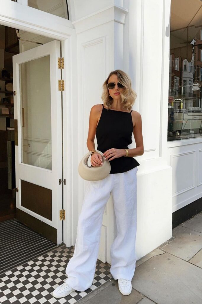 Whether you’re exploring city streets or grabbing coffee with friends, this combo proves that a sharp sneaker can transform simple linens into the season’s must-try anti-jeans outfit.