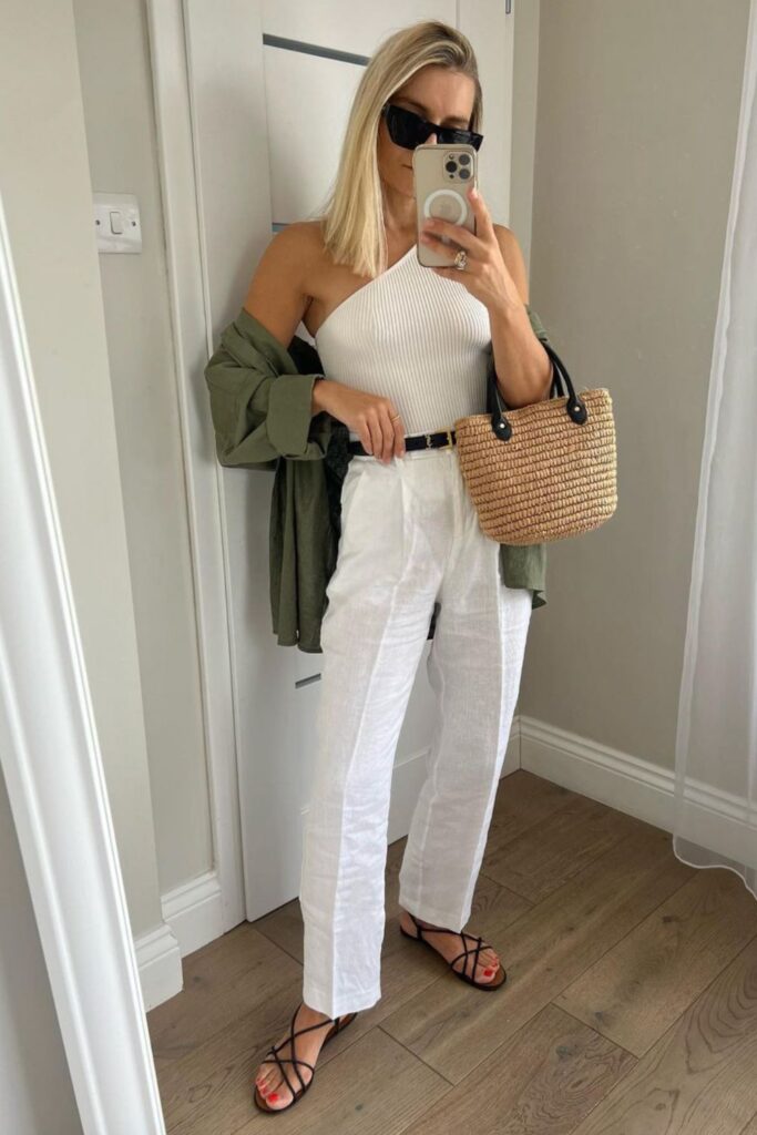 Effortless layering takes center stage when an olive-green overshirt is draped over a simple black tank and crisp white linen trousers. The trousers’ relaxed straight-leg cut lets the ankle-baring strappy black sandals shine, adding an architectural twist that elevates the look beyond basic separates.