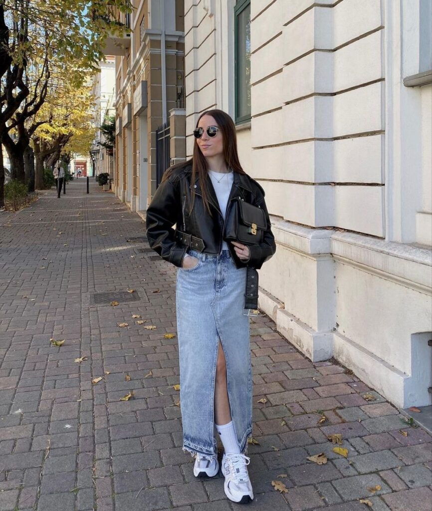 A laid-back denim maxi skirt with a subtle slit anchors this effortlessly chic outfit. The cropped black jacket adds structure, while the black tank top creates a streamlined base. White sneakers paired with visible socks keep the look sporty and relaxed, offering a youthful vibe.