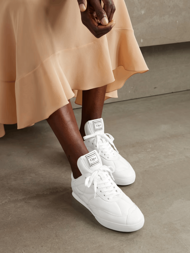 Envision yourself on a chic Parisian street, wearing Chloé Kick Leather Sneakers. These shoes are synonymous with luxury and high fashion, crafted with premium leather. Their sleek design and elegant details make them a standout choice for those who value style and sophistication. Perfect for a day of shopping or a stylish lunch, they pair beautifully with upscale outfits.