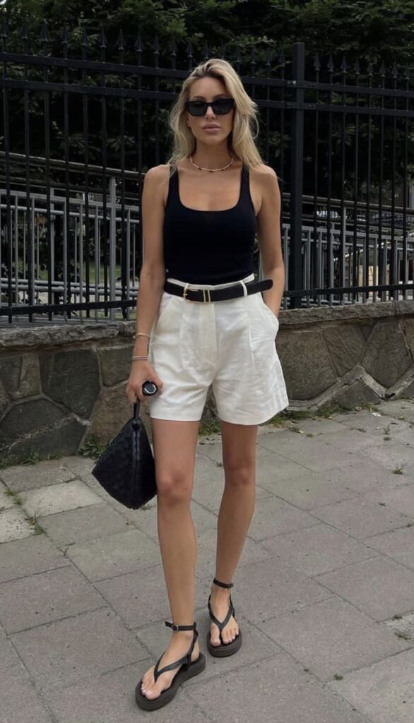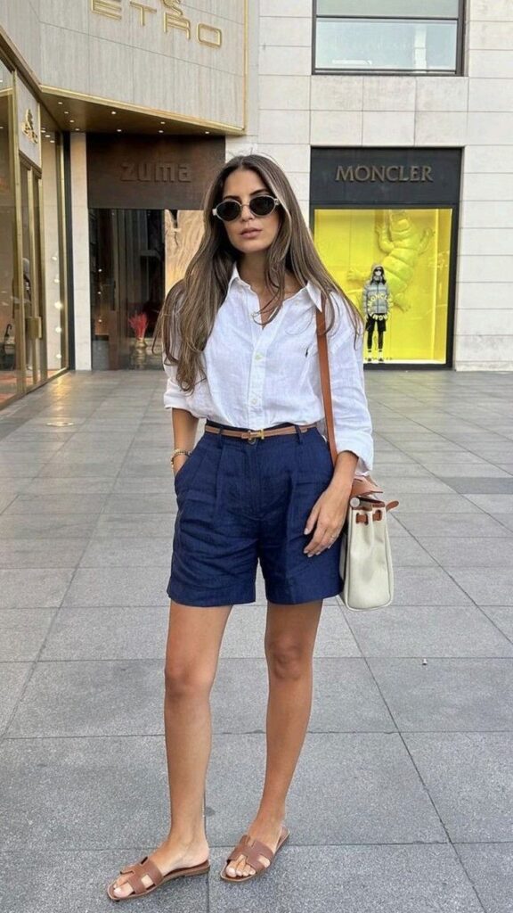 Oversized rectangular sunglasses and delicate gold hoops provide just the right dash of metropolitan flair. This ensemble proves that linen shorts, when paired with refined staples and thoughtful accessories, are the ultimate summer style secret.