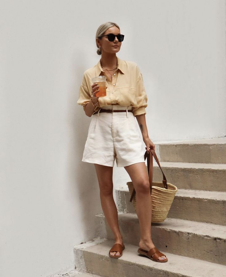Trendy sunglasses and slim gold hoops punctuate the look with metropolitan flair, proving that simple linen shorts can form the backbone of peak summer chic.