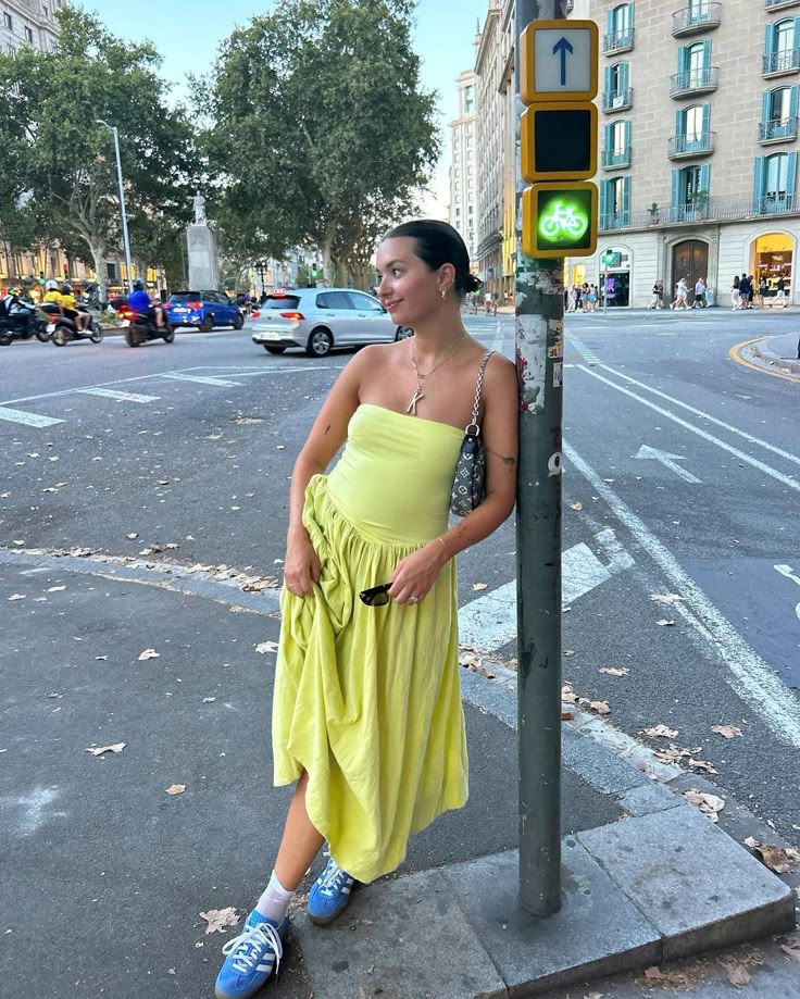 The strapless drop-waist dress gets a bold, urban twist with this lime-yellow number styled alongside blue retro sneakers and white crew socks. The gathered hipline creates beautiful draping and movement, while the vibrant hue is as fresh as it is statement-making.