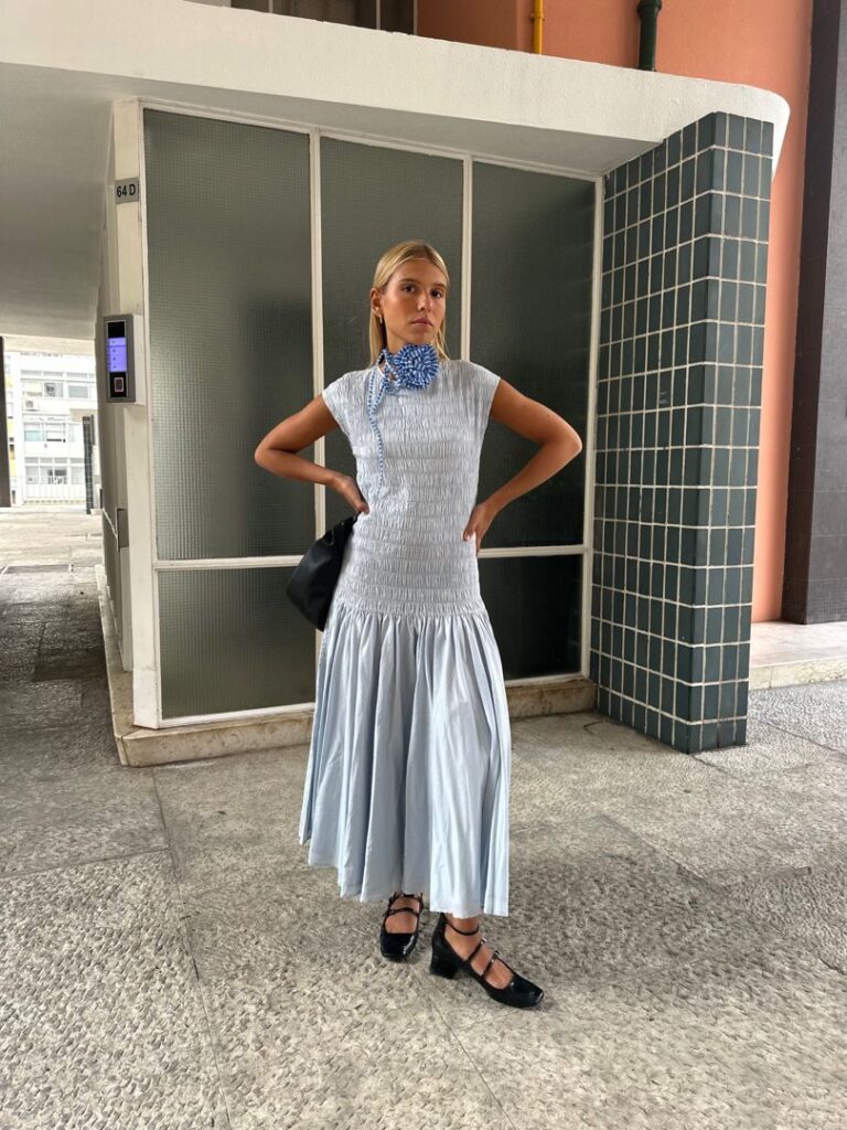 Channeling quiet elegance with a retro twist, this powder-blue drop-waist dress merges delicate smocking with voluminous ease. The fitted bodice transitions seamlessly into a full gathered skirt, emphasizing the waist in an understated, yet feminine way.