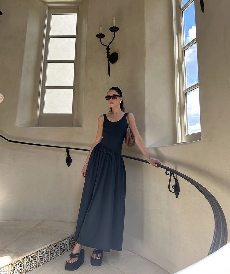 Understated yet striking, this sleeveless black drop-waist dress delivers the perfect balance between structure and flow. The fitted bodice skims the frame while the gathered skirt adds movement and a hint of vintage romance.