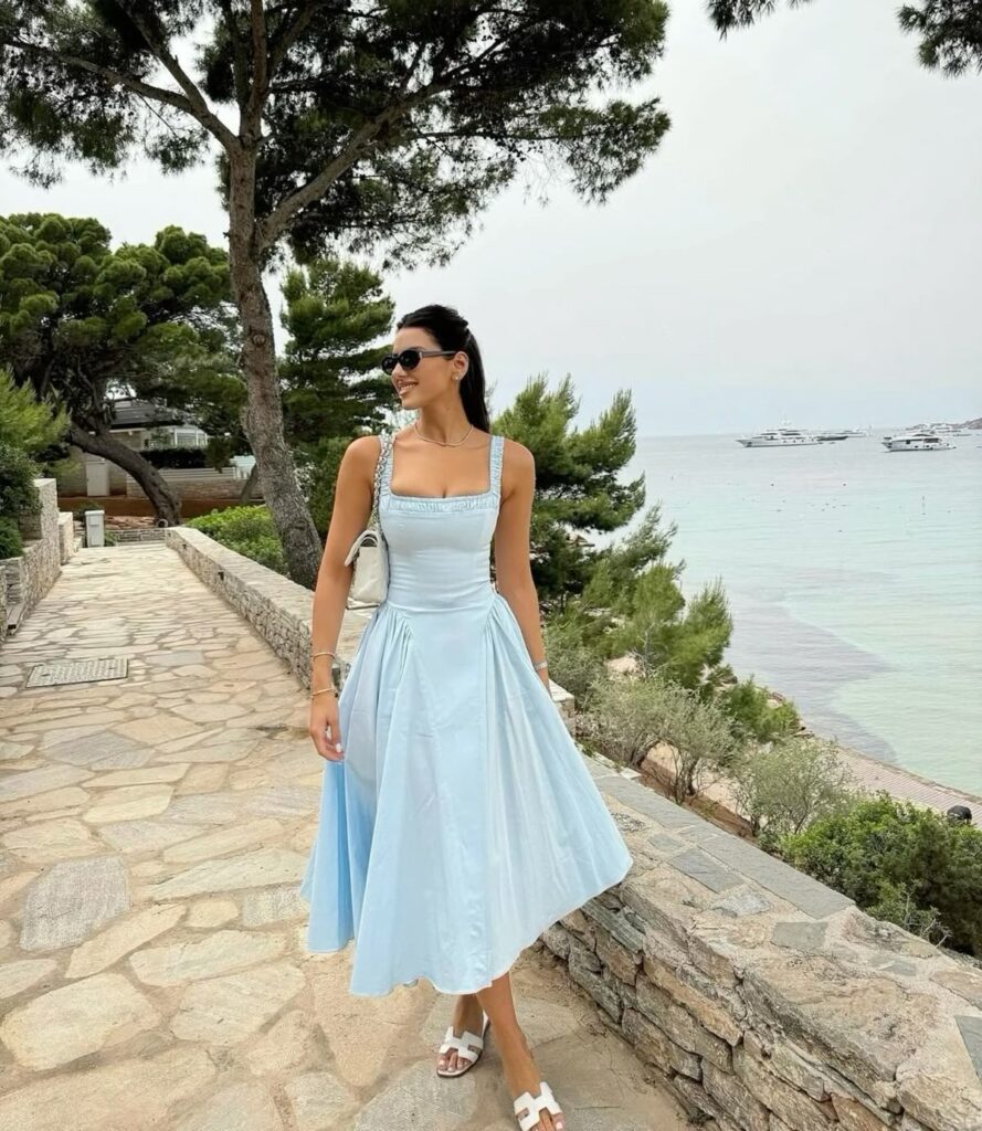 White Hermès sandals and a quilted shoulder bag complete the palette with timeless polish. The silver jewelry and black cat-eye sunglasses lend a subtle edge to the soft color story. Altogether, it’s a refined vacation look that blends classic charm with modern grace.