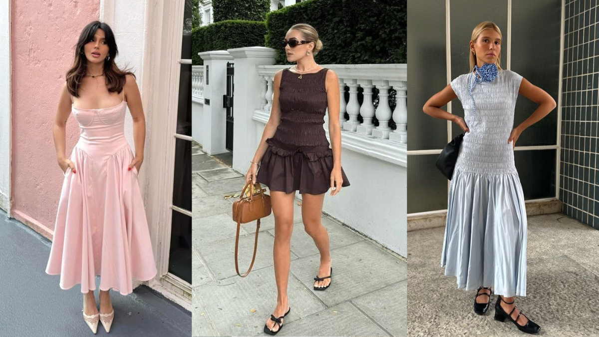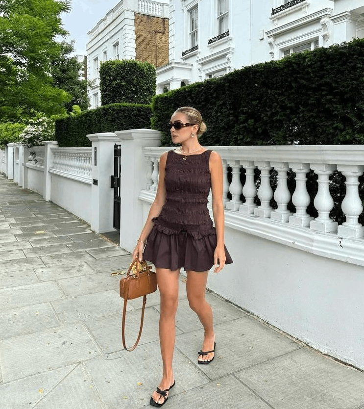 A flirty mini version of the drop-waist dress brings playful ease to this summer look. With its corset-inspired bodice and dramatically flared hem, the silhouette evokes a touch of ballerina romance while keeping things modern and street-style ready. The pairing with black thong sandals adds a minimal, laid-back contrast that grounds the ultra-feminine shape.