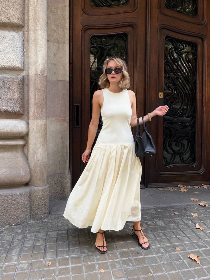 Blending throwback charm with modern restraint, this drop-waist dress embodies the understated side of 2025’s hottest silhouette revival. The sleeveless, fitted bodice gives way to a dramatically gathered skirt, creating subtle volume that elongates the figure without overwhelming it.