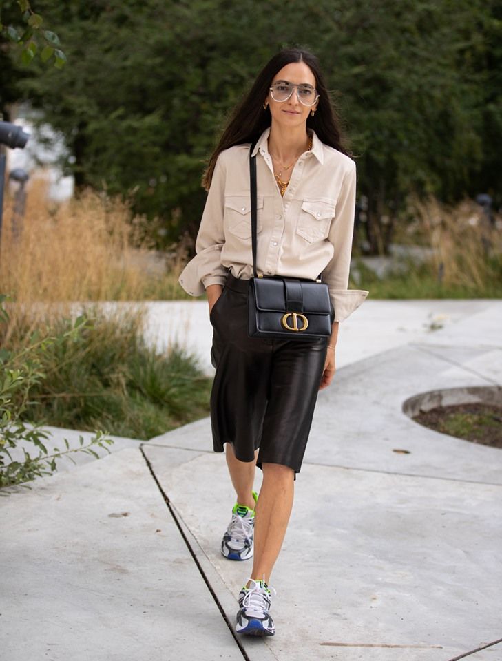 Finishing touches—a structured black clutch and slim rectangular shades—underscore the outfit’s metropolitan polish. This ensemble proves long shorts aren’t just for boardwalks; styled with intention, they can be true game-changers.