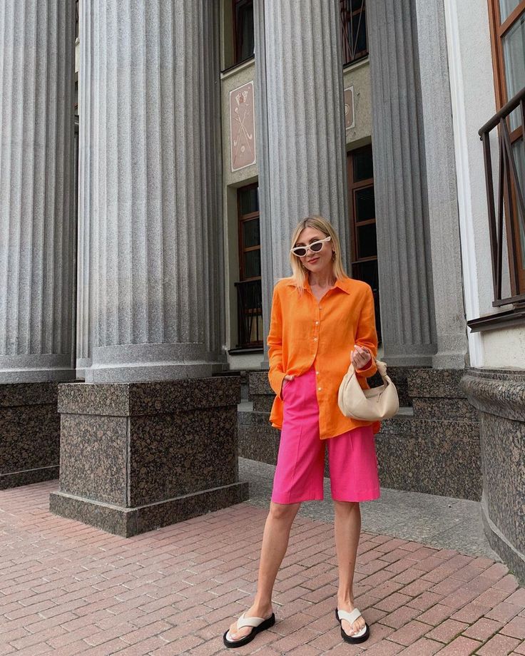 A vibrant tangerine linen shirt brings a burst of sunset warmth, its relaxed drape striking the perfect off-duty balance. Paired with hot-pink tailored Bermudas that skim just above the knee, this look proves long shorts can be endlessly chic.