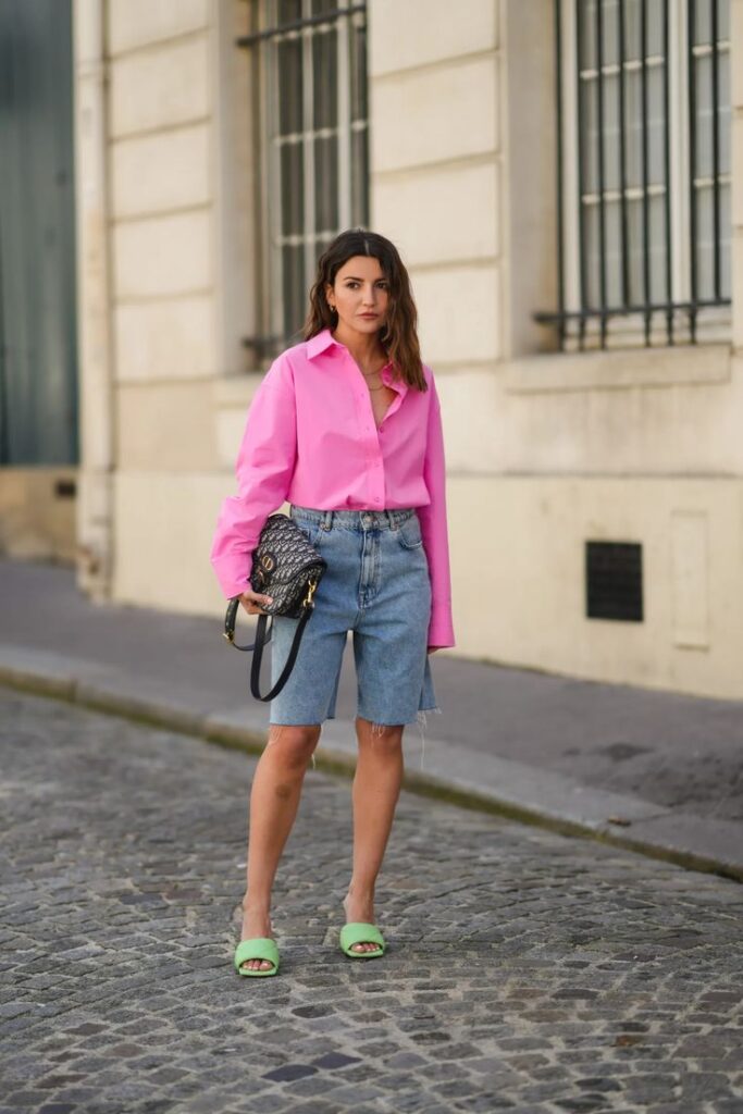 A punchy fuchsia button-down instantly transforms classic long-length denim shorts into a style statement, the bold color drawing the eye from collar to cuff. The high-rise Bermuda silhouette skims just above the knee, offering polished proportions that feel far more refined than your average cutoff.