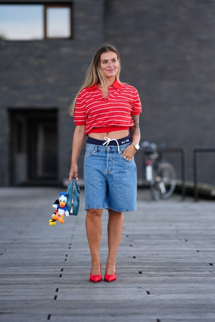 A bold red-and-white striped polo, cropped to just kiss the waistband, reimagines classic knitwear with playful attitude. The long denim shorts boast a clean, high-rise cut and raw-hem detail, striking the perfect balance between laid-back cool and tailored polish.
