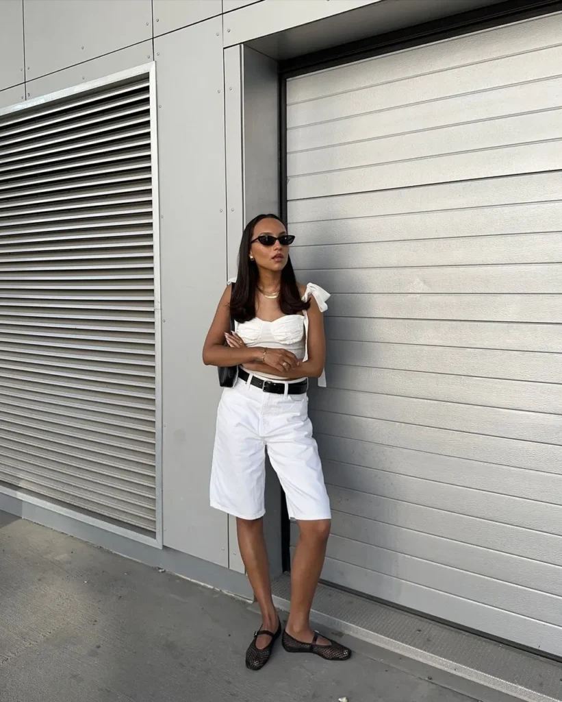 Crisp white long shorts hit just below the knee in a sleek, tailored cut that elevates the everyday into something unexpectedly refined. Paired with a sculptural white corset-style crop top—complete with delicate tie straps—the look feels fresh, modern, and utterly summer-ready.