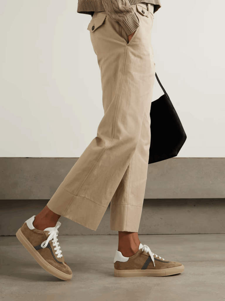 BRUNELLO CUCINELLI’s bead-embellished sneakers bring a touch of luxury to casual footwear. The leather-trimmed suede offers a rich texture, enhanced by delicate beadwork. Perfect for a laid-back office day, they offer a comfortable yet stylish option.