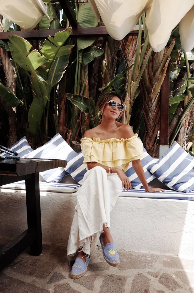 Golden hour meets effortless charm in this breezy summer ensemble. The soft yellow off-the-shoulder ruffle top radiates warmth, while the relaxed white linen skirt with a raw, frayed hem adds an easygoing edge. It’s a look that balances femininity with comfort—perfect for vacation strolls or lounging at a stylish beachside café.