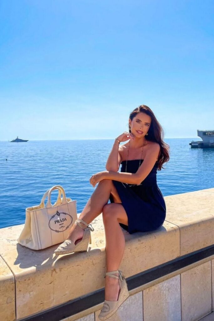 The ankle ties add a romantic, feminine flair, while the straw Prada tote enhances the coastal-chic vibe. Whether you’re brunching by the harbor or exploring a cobbled old town, this outfit nails that vacation-ready ease with a polished twist.