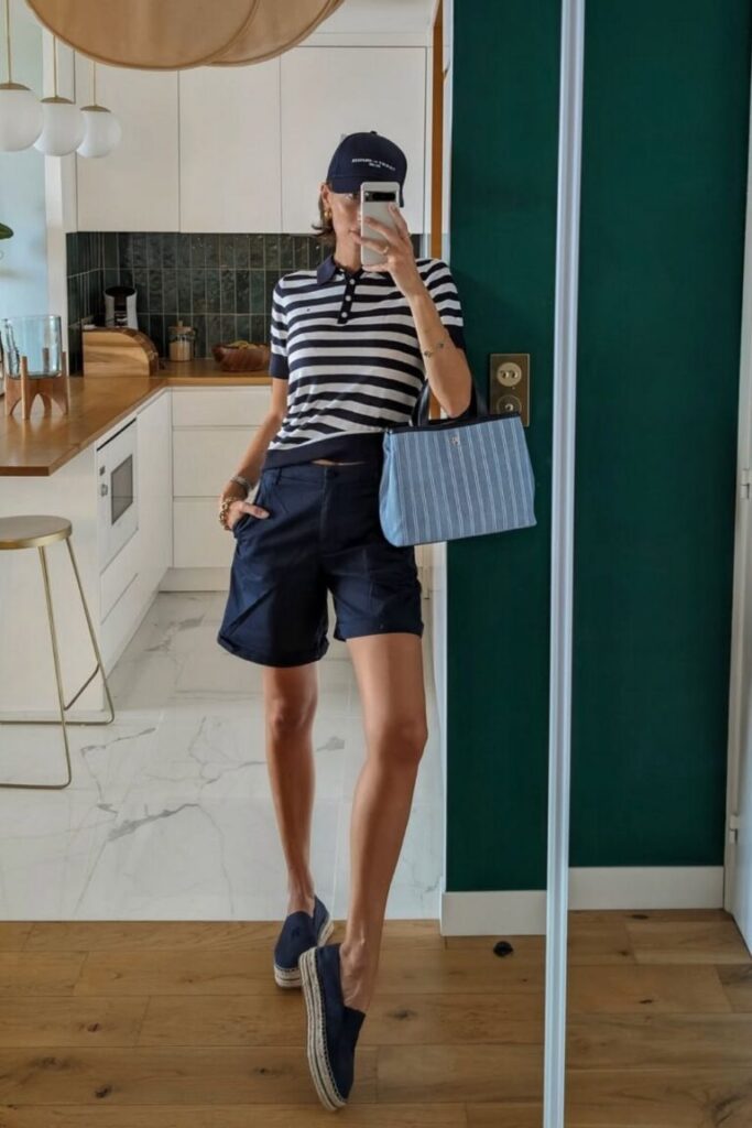 Sail into summer with a look that’s as crisp as an ocean breeze. A navy-and-white striped polo tucked into tailored navy shorts instantly channels that timeless coastal charm, while classic navy espadrilles keep the vibe grounded and relaxed.