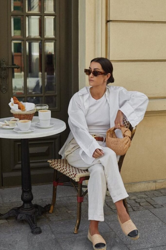 If Parisian café chic had a uniform, this would be it. With an all-white palette anchored by luxe two-tone Chanel espadrilles, this look balances elegance and ease in perfect proportions. The oversized button-down and crisp trousers keep things polished, while the woven mini bag and tortoiseshell sunglasses add that subtle touch of personality.
