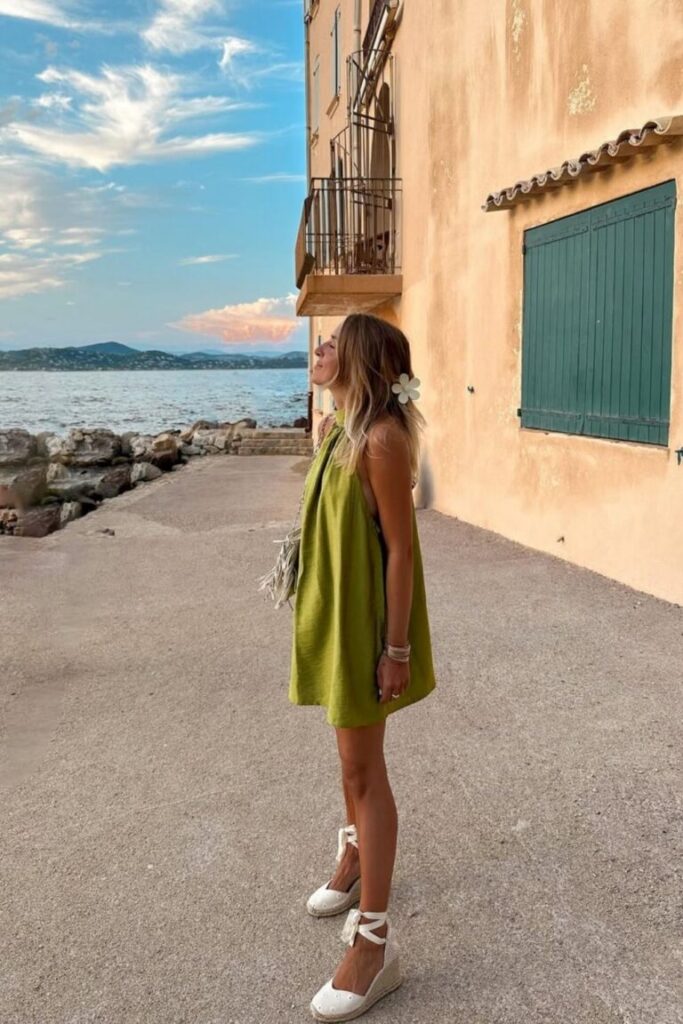 But it’s the classic white espadrille wedges that steal the show, adding just the right amount of coastal romance to the look. Whether you’re heading to a beachside dinner or strolling through a Mediterranean village, this outfit nails the easy elegance that summer nights call for.