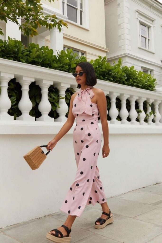 This look is the perfect mix of retro charm and modern polish. The blush pink halter jumpsuit with playful black polka dots makes a bold yet feminine statement, while the high waist and cropped hem keep things flattering and fresh.