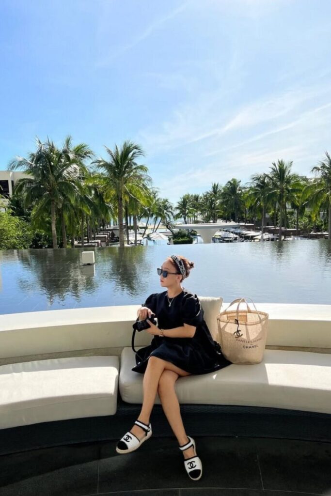 Oversized sunglasses and a printed headband add personality, while a sheer Chanel beach tote pulls the look together with designer flair. Whether you’re snapping vacation photos or simply sipping something chilled, this ensemble masters the art of stylish relaxation.