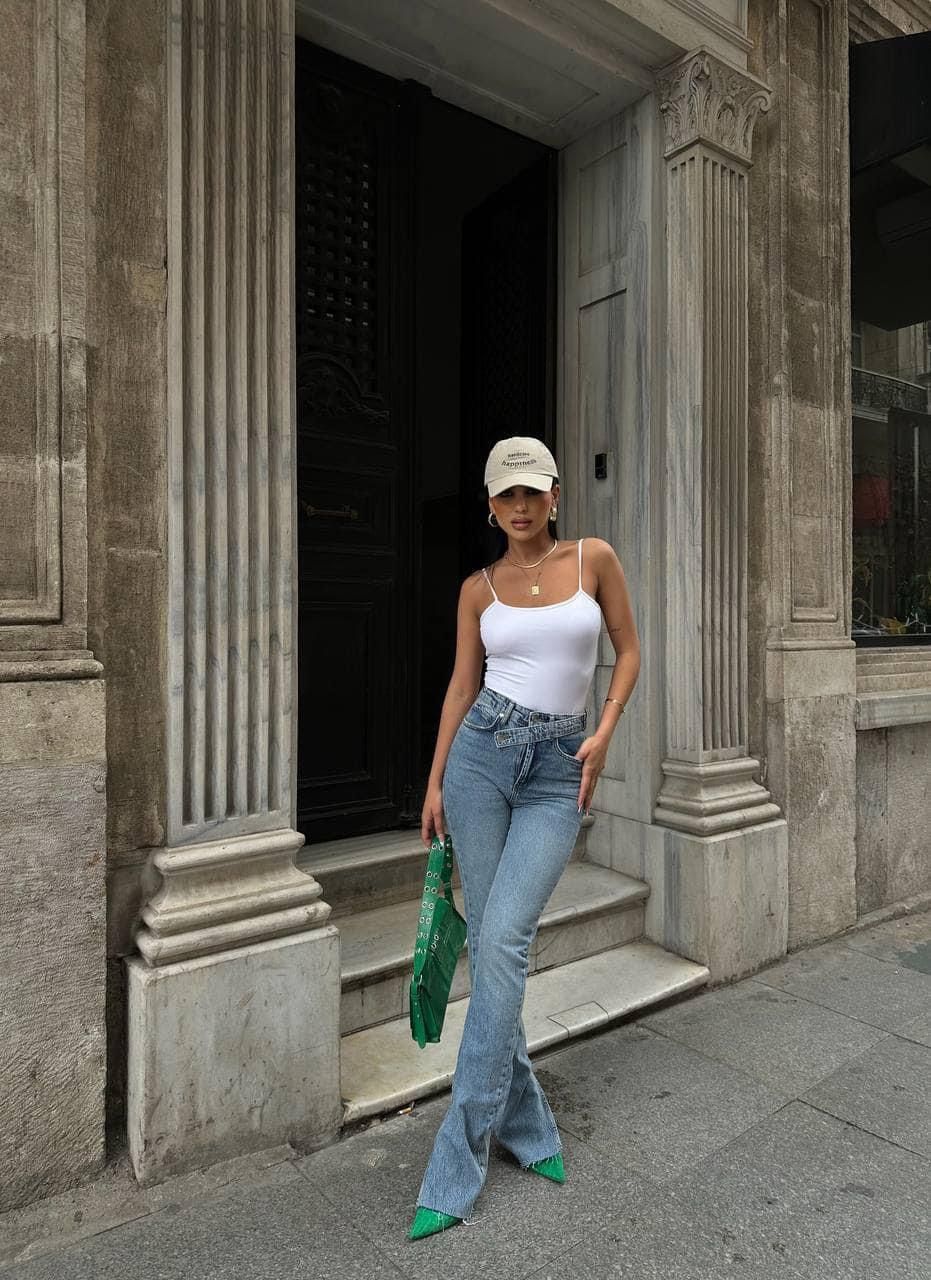A classic white tank and high-waisted jeans set the tone for an effortlessly cool look, but it’s the details that make it shine. The vibrant green pointed heels and matching bag add a bold, unexpected pop of color, instantly transforming the outfit from simple to standout. A beige baseball cap adds an athletic twist, lending a relaxed, modern feel while keeping the look grounded and approachable.